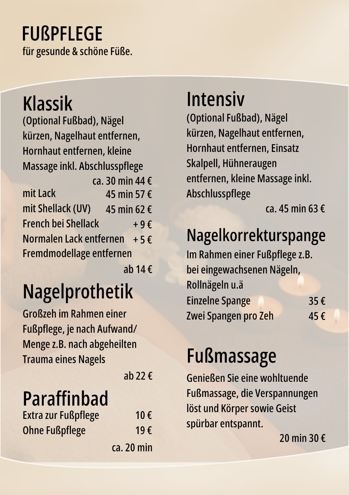 Erlebe die Welt der professionellen Fußpflege. Unser erfahrenes Team verbindet nicht nur ästhetische Aspekte, sondern legt auch ein besonderes Augenmerk auf die ganzheitliche Behandlung deiner Füße. Genieße eine individuelle Beratung und Pflege um dein Wohlbefinden zu steigern.
